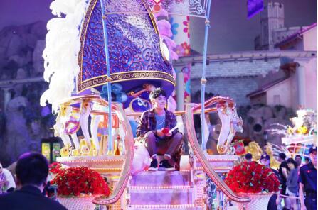郭聪明乘坐花车,与粉丝热情互动,并下车与粉丝们握手致谢,感谢他们来到罗蒙环球乐园与他见面,粉丝们追随着他的花车拍照欢呼,现场氛围再一次达到高潮。